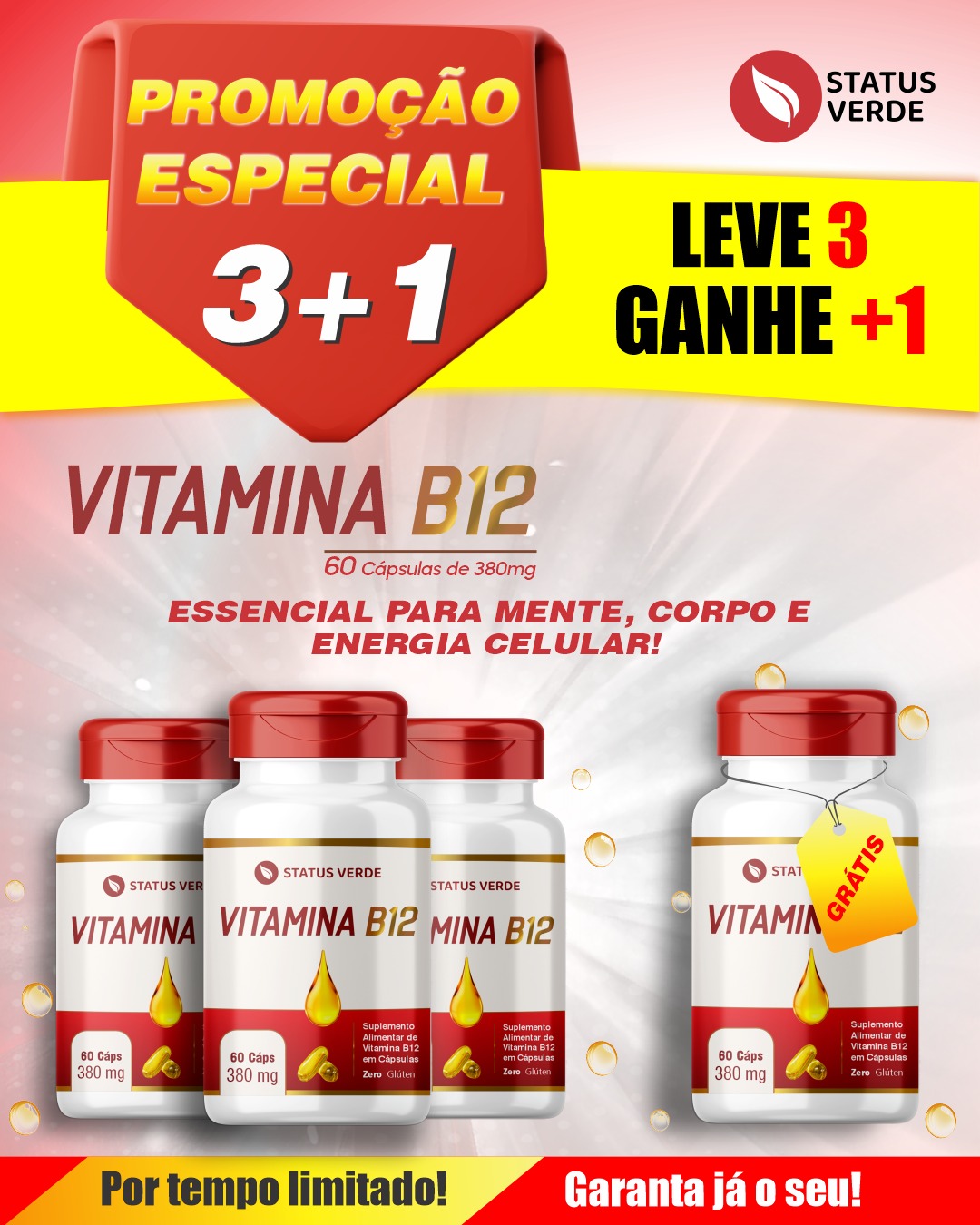 PROMOÇÃO - Kit 3 Vitamina B12 Metilcobalamina 180 Cápsulas 380 mg Status Verde 1 GRÁTIS